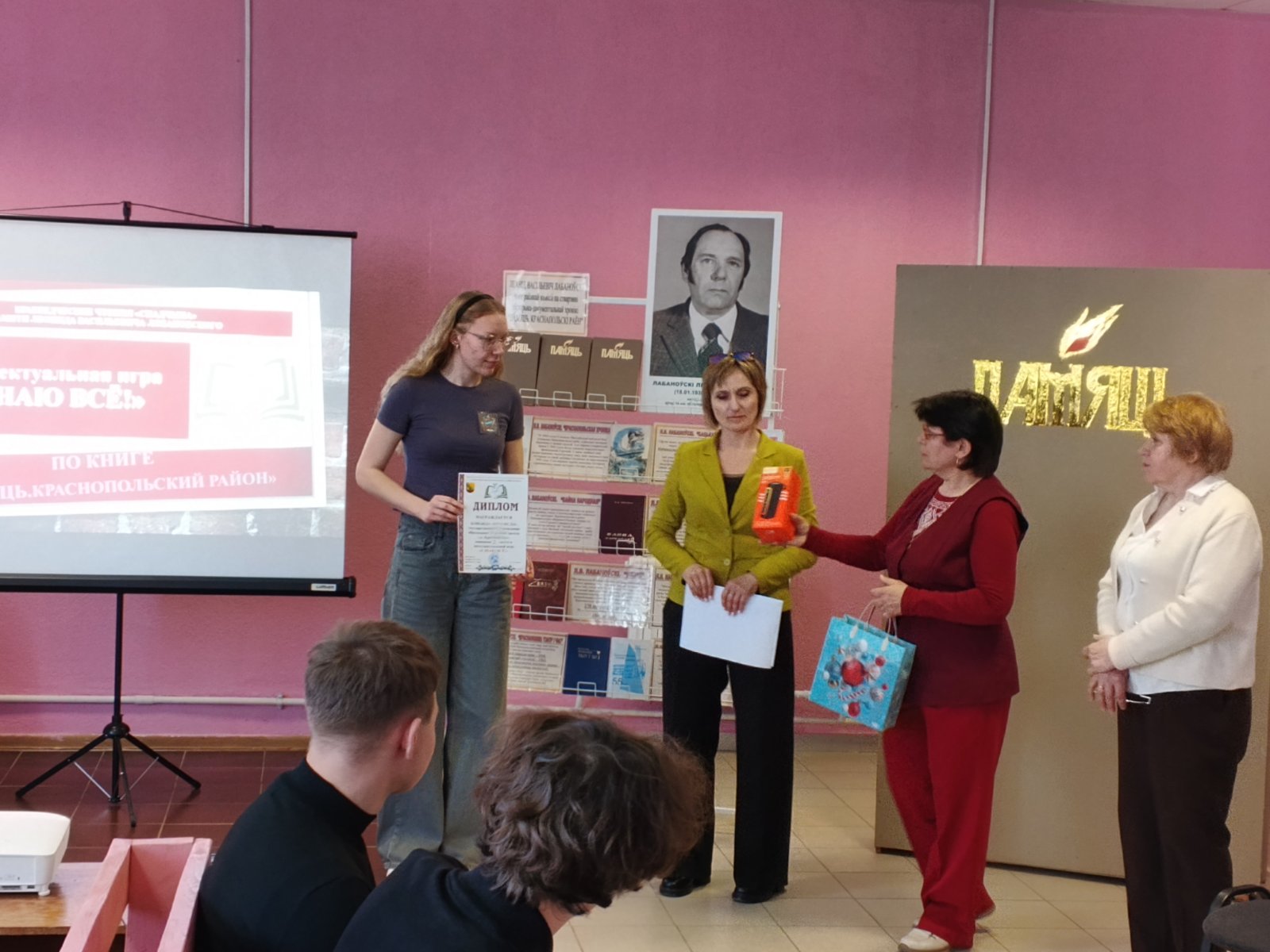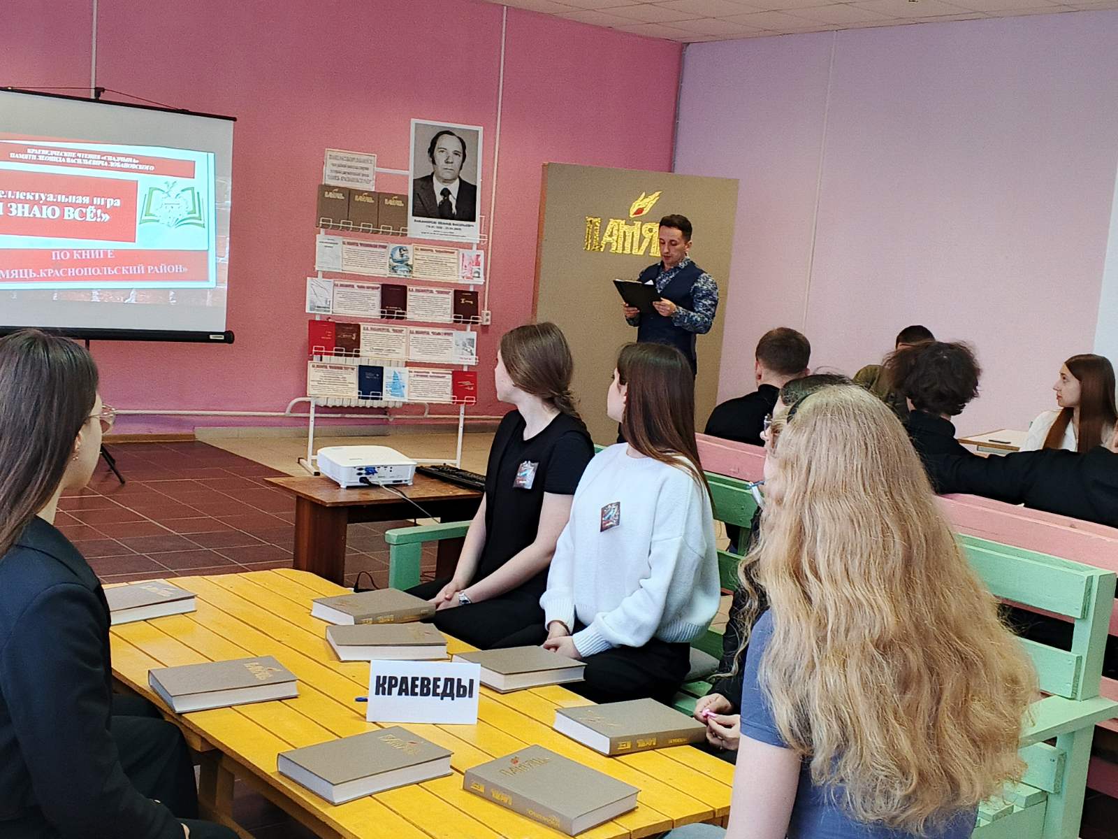 Краснопольская центральная районная библиотека им. М. Ткачёва, в молодёжном центре культуры и досуга «Мираж» провела интеллектуальную игру, по страницам историко-документальной хроники «Память. Краснопольский район», «Я знаю всё», в которой приняли участие две команды. Команда «Краеведы» (Средняя школа г.п. Краснополье) и команда «Победа» (Краснопольская районная государственная гимназия).